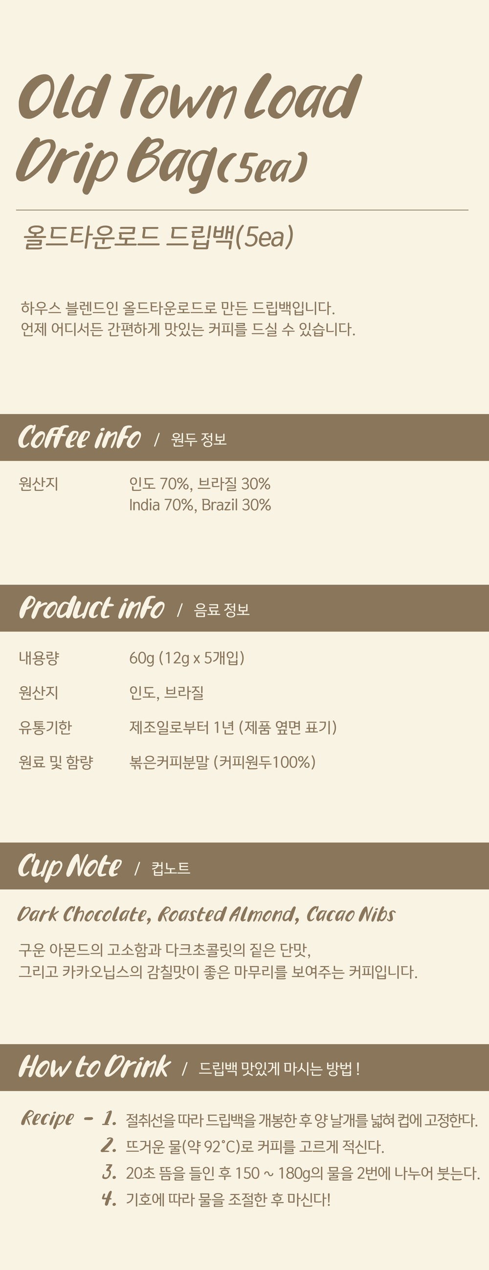 하우스블렌드인 올드타운로드로 만든 드립백입니다.