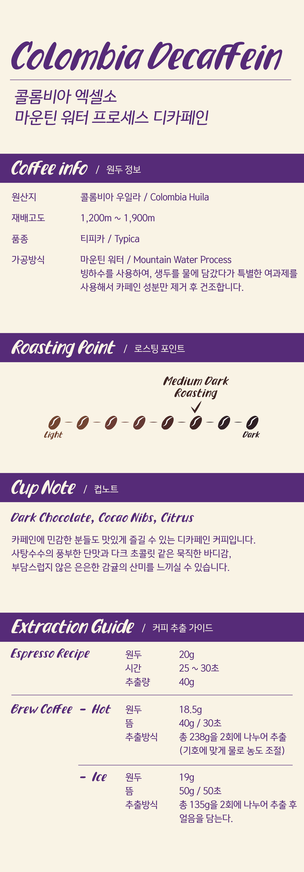 콜롬비아 엑셀소 마운틴 워터 프로세스 디카페인 싱글오리진