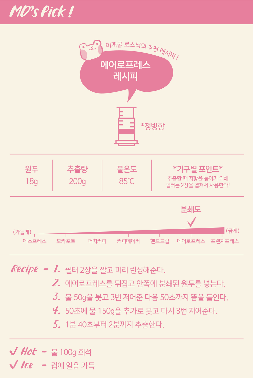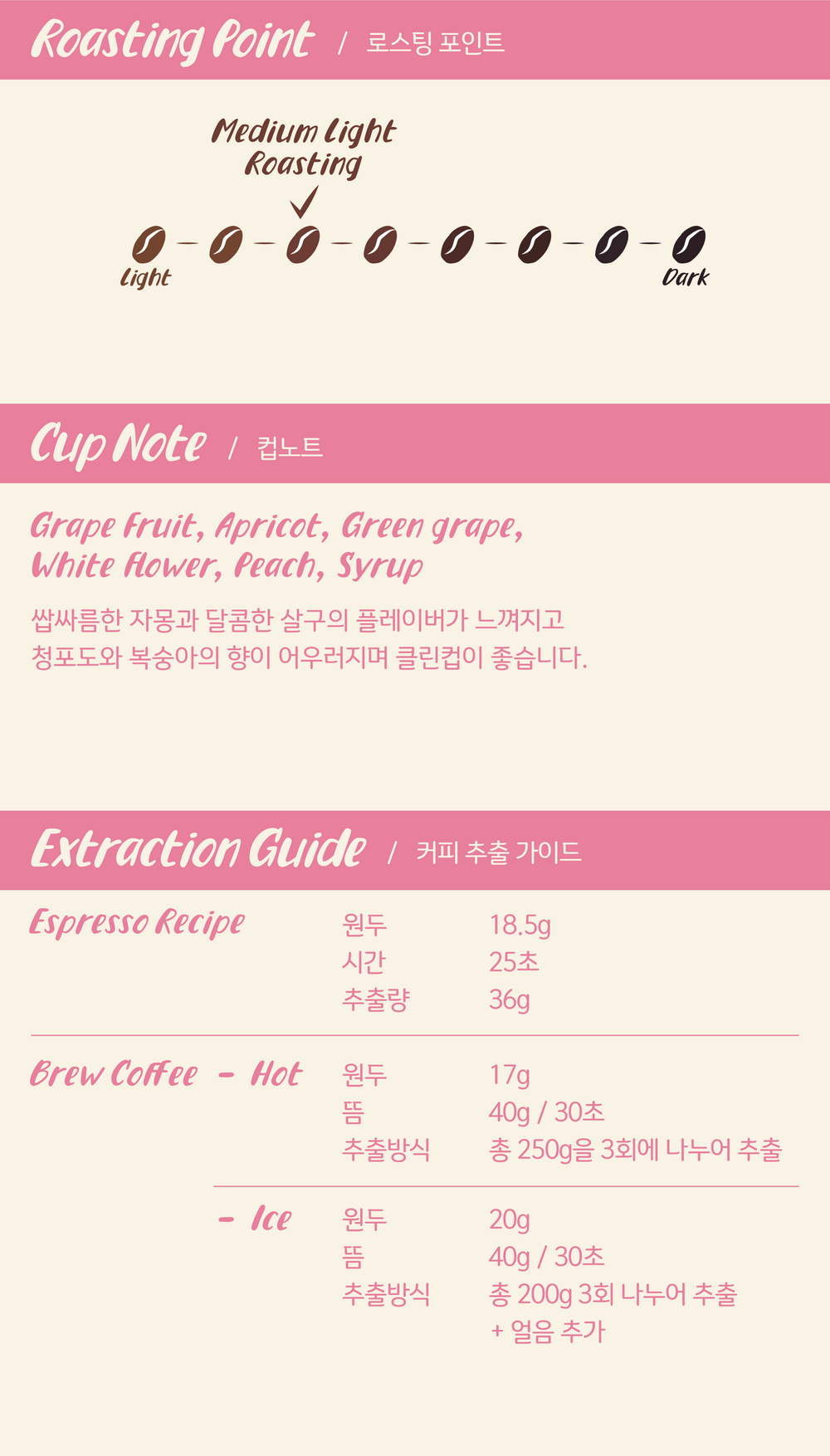 쌉싸름한 자몽과 달콤한 살구의 플레이버가 느껴지며 청포도와 복숭아의 향이 어우러지며 클린컵이 좋습니다.