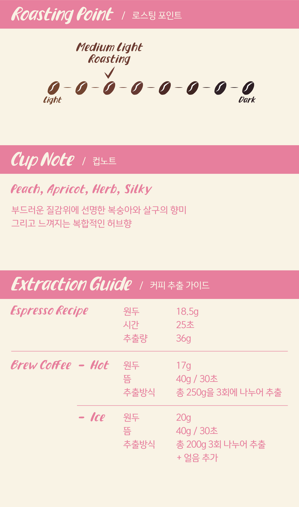 부드러운 질감위에 선명한 복숭아와 살구의 향미 그리고 느껴지는 복합적인 허브향
